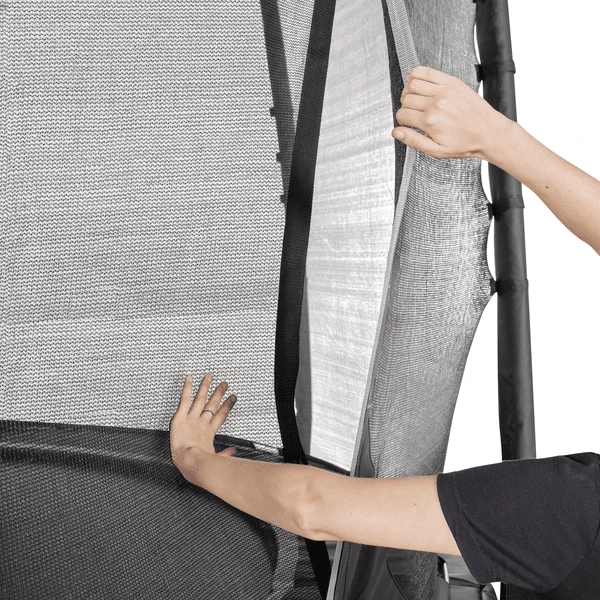 Het zwarte frame, subtiele kleurdetails en reflecterende biezen geven de grote trampoline een robuuste uitstraling.