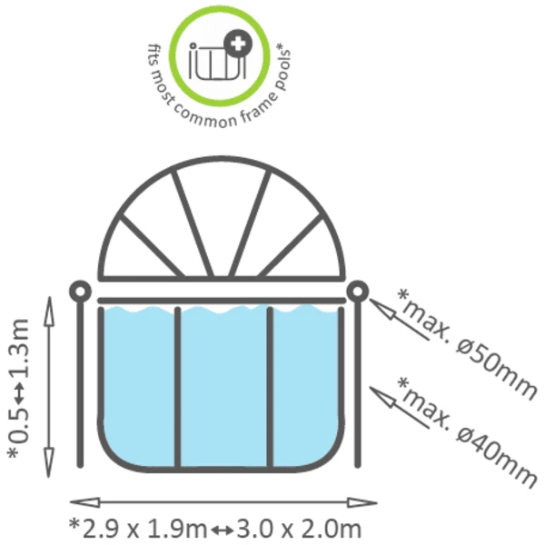 - Voor zwembaden met een afmeting van 290 x 190 tot 300 x 200 cm