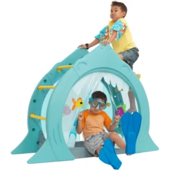 De open mond van het klimrek Flee from the Shark van KidKraft nodigt u uit om te ontdekken en te sporten in het comfort van uw eigen tuin. Duik in het blauwe, transparante “nat” naar de kleurrijke vissen op de bodem van de zee. In het spel graven ze dan schatten op de zeebodem op en zoeken naar schelpen (het geheel wordt nog realistischer als je de doos vult met Sand ). Of de kleintjes klimmen op de rug van de haai om hem te temmen en op de golven te rijden. Een hele scheepslading zeemansgaren wacht op u in het innovatieve klimrek Flee the Shark van KidKraft .