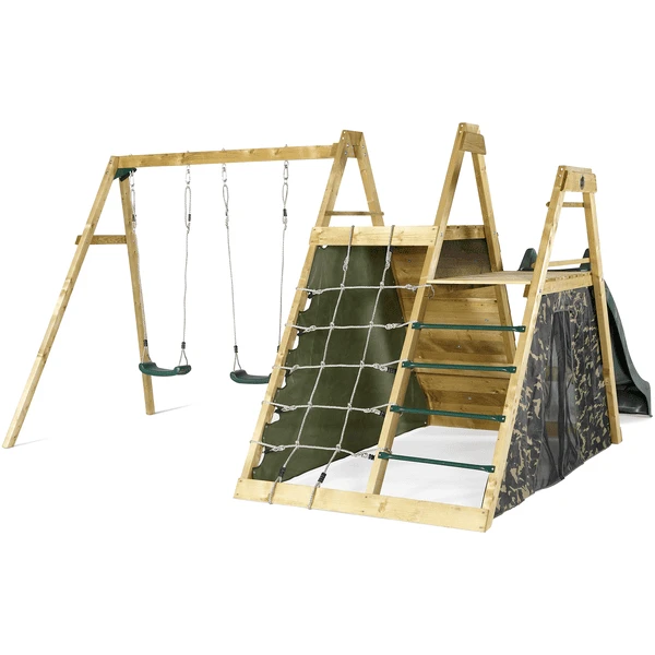 Inclusief twee schommels met in hoogte verstelbare stoelen. Geschikt voor kleine krijgers van drie tot twaalf jaar.