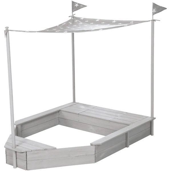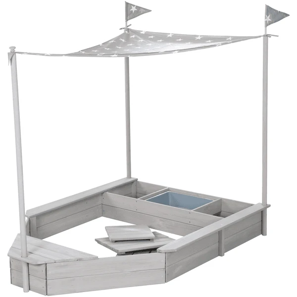 Het Sand box-schip is uitgerust met veel bergruimte, een zonnekap en twee vlaggen in de Little Stars Design . Dankzij het praktische opbergvak onder de bank vindt veel speelgoed daar een plaatsje en wordt zo beschermd tegen weer en wind. Hier is ook een plastic bak voor Sand .