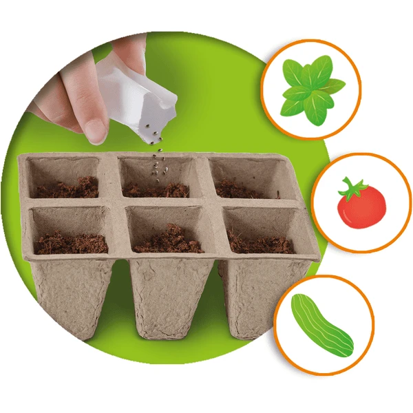 - Vervolgens vult u de aarde in de potten en zaait u de zaden van tomaat, basilicum of komkommer.