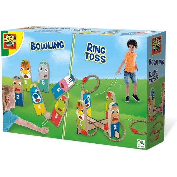 Met deze 2-in-1 set van kegelen en ringwerpen van SES Creativ e hoef je niet meer te kiezen, want hier kun je het allebei doen, binnen en buiten. Om te kegelen zet je de houten figuren in grappige diermotieven neer, zoals een sterke olifant of een schattige kikker, bepaal je de werpplek en probeer je alle dieren – in het beste geval allemaal tegelijk – omver te gooien met de houten bal.