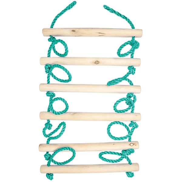De zes hoogwaardige ronde houten treden zijn onbehandeld en hebben een breedte van 38 cm met een afstand van 30 cm tussen twee sporten. Hun diameter is iets meer dan 3 cm. Het ca. 1,2 cm dikke, weerbestendige blauwe kunststof touw is aan de bovenzijde gesloten. Dit dient voor het eenvoudig doorlussen van de ladder rond de ninja-lijn of een tak. Het maximale draagvermogen is 80 kg. Dit dient voor het eenvoudig doorlussen van de ladder rond de ninja-lijn of een tak. Het maximale draagvermogen is 80 kg.