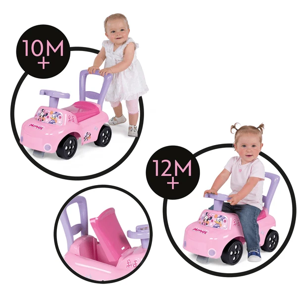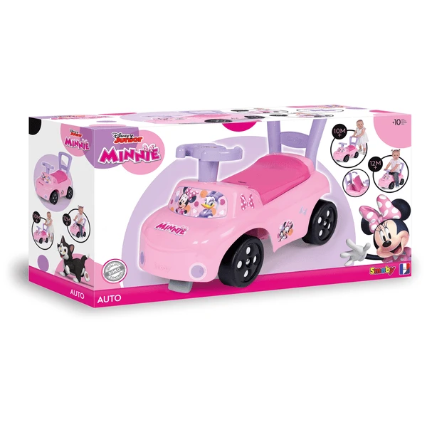 Minnie, de vriendin van Mickey Mouse en alle kinderen, is in kleurrijke motieven terug te vinden op de bijgeleverde stickers. De lichtgewicht ride-on is uiterst wendbaar en het antislipstuur zorgt voor een goede grip, zelfs op snellere ritten. Dankzij de stevige constructie garandeert dit duurzame ride-on voertuig veilig rijplezier, zowel binnen als buiten! Het slimme product design biedt ook een rugleuning die gemakkelijk vast te pakken is. Dit maakt het gemakkelijk om de eerste stapjes te oefenen terwijl je de auto duwt. Tot de peutervriendelijke voorzieningen behoort een opbergvak onder de zitting, waarin het favoriete speelgoed kan worden meegenomen op een spannende ontdekkingsreis. De lage zithoogte maakt het gemakkelijk op en af te stappen. De anti-tipper aan de voor- en achterkant zorgt voor extra stabiliteit.